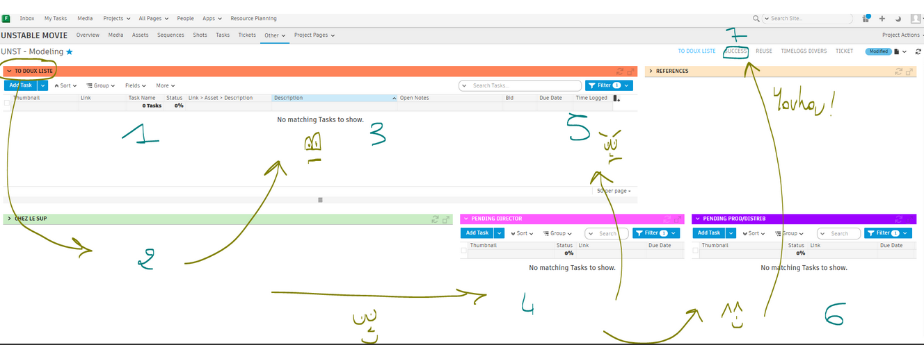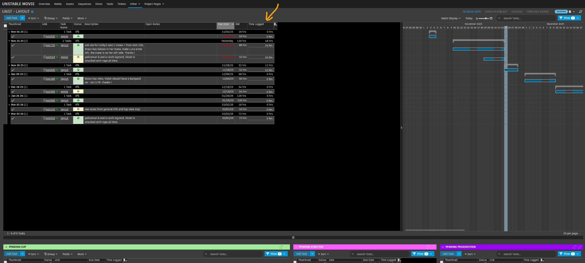 You will find on the same page your due dates (when you need to delivery the shots), the bids (how long you should work on that task), the timelogged ( how much you already spent on that task), open note by the director or your sup (yellow - about your task) and description (green - general note of the shot) have to be read. They can contain precious information you need to know before starting.